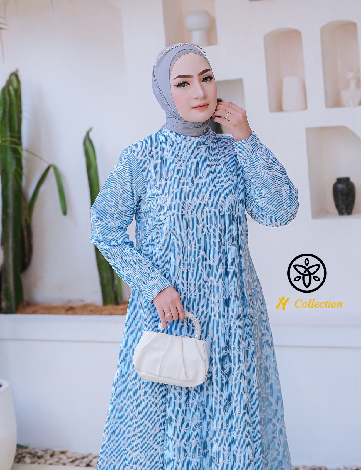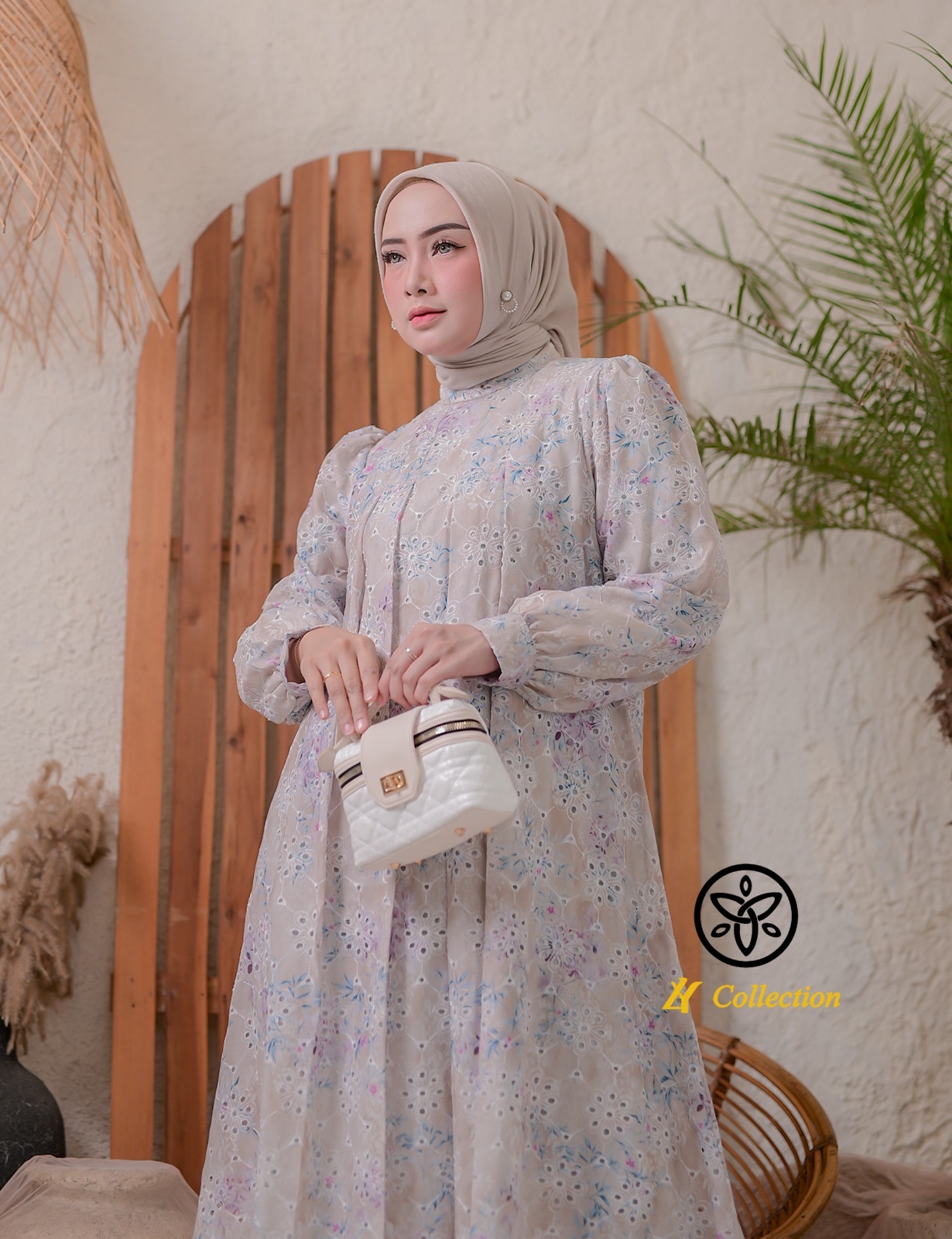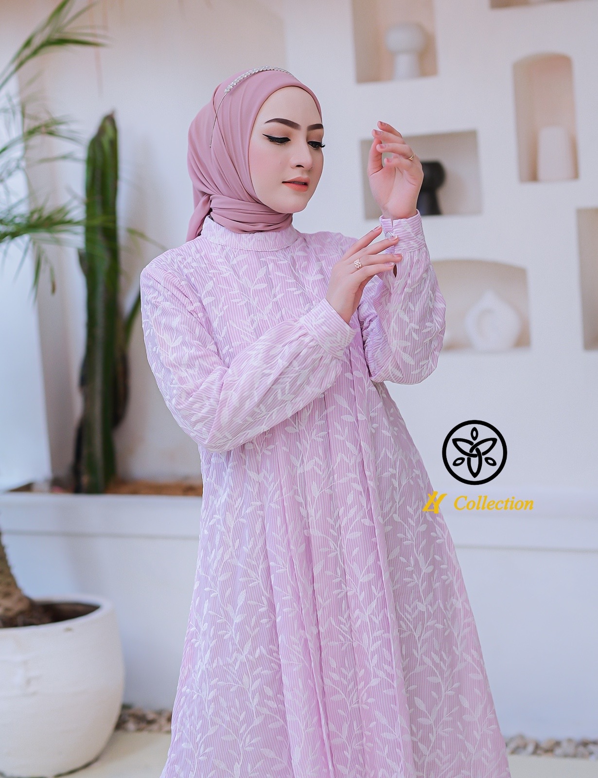 Gamis Modern warna pastel yang cantik. Motif lembut yang memberi kesan elegan dan fresh.