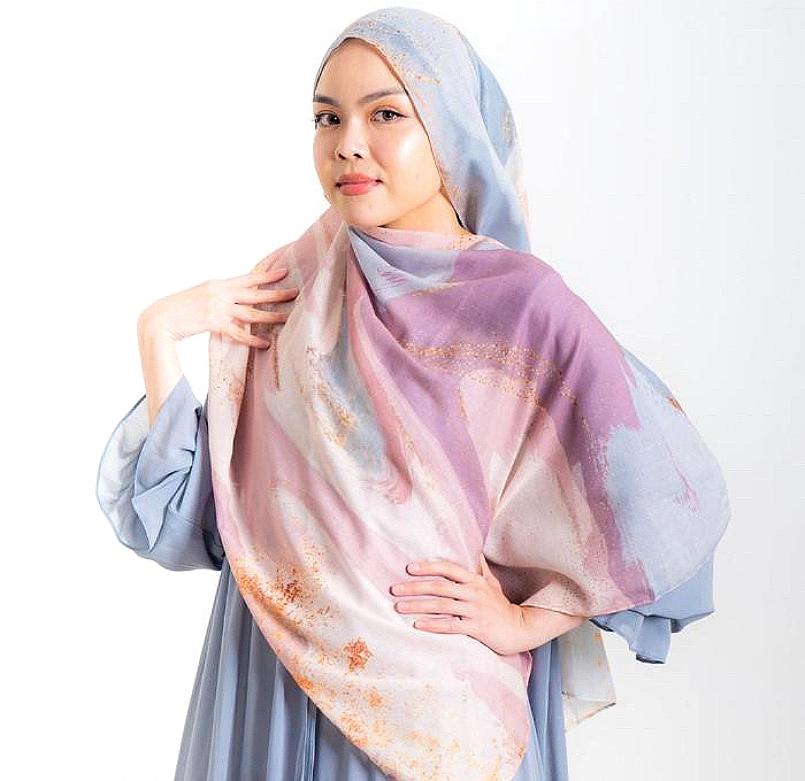 Jadilah pusat perhatian dengan pashmina motif abstrak eksklusif. Perpaduan warna lilac, blush, dan biru pastel dengan taburan kilau keemasan yang mewah. Terbuat dari bahan cerutti premium yang flowy dan elegan.